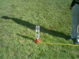 Eine PET-Flasche wird zu einem Teil mit Wasser gefüllt und mit einem Ventil verschlossen. Mit einer Velopumpe wird Luft in die senkrecht gestellte Flasche gepumpt. Wenn ein genügend hoher Druck in der Flasche herrscht, wird das Ventil abgesprengt und das Wasser - Luft - Gemisch mit hoher Geschwindigkeit ausgestossen – die Rakete fliegt in die Höhe. Sowohl Wasser, wie auch Luft müssen in der Flasche vorhanden sein: